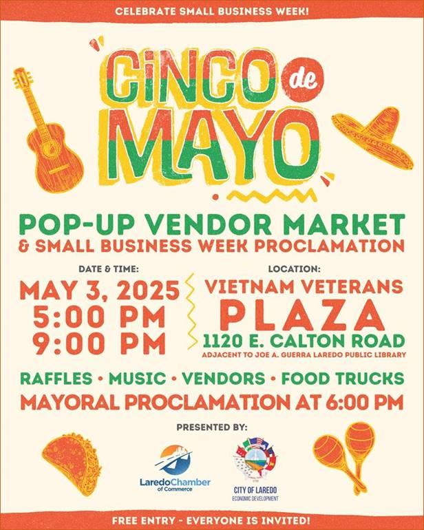 LAREDO, TX – The City of Laredo Economic Development Department, in collaboration with the Laredo Chamber of Commerce, will host a proclamation presented by Mayor Dr. Victor D. Treviño on Saturday, May 3, 2025, at 6:00 PM. This ceremony will be part of the Cinco de Mayo Pop-Up Vendor Market, which will officially kick off National Small Business Week (NSBW) at the Vietnam Veterans Plaza (1120 E. Calton Road, adjacent to the Joe A. Guerra Laredo Public Library) from 5:00 PM to 9:00 PM. The event will feature live music, raffles, food trucks, and a variety of local vendors.