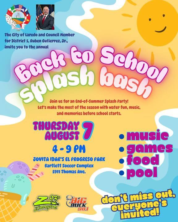 LAREDO, Texas – The City of Laredo and District 5 Council Member Ruben Gutierrez, Jr. will host the Annual Back to School Splash Bash, a vibrant, end-of-summer celebration designed to bring families together before the start of the new school year.