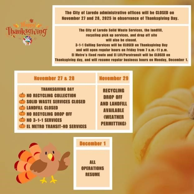 LAREDO, Texas – The City of Laredo announces the closure of all administrative offices in observance of Thanksgiving Day on Thursday, November 27 and Friday, November 28, 2025. All services will resume to normal operations hours on Monday, December 1, 2025. Certain operations and services will continue to be offered as indicated below: