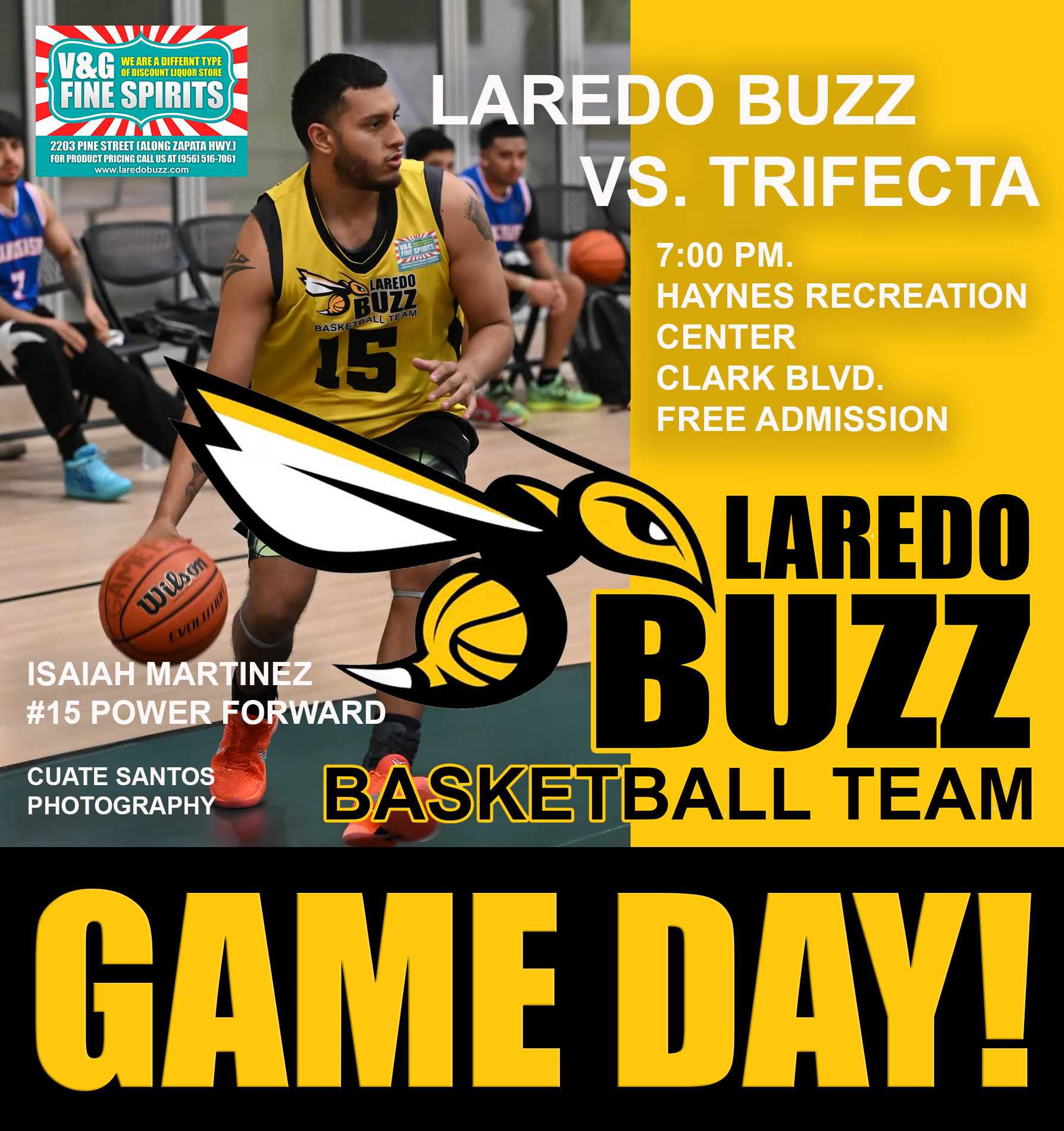 (Laredo, Texas)-The Laredo Buzz Basketball Team takes on Trifecta a strong veteran playoff caliber team lead by Ricky Arana, Robert Zepeda, Jesus Fraga, Edgar Fraga, and Miguel Robles. The game will be played tomorrow evening at 7:00 pm. at the Haynes Recreation Center located on Clark Blvd.