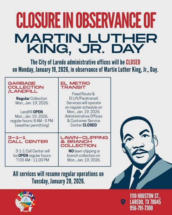 LAREDO, Texas – The City of Laredo announces the closure of all City of Laredo administrative offices in observance of Martin Luther King, Jr. Day, on Monday, January 19, 2026. However, essential services will remain operational as follows: