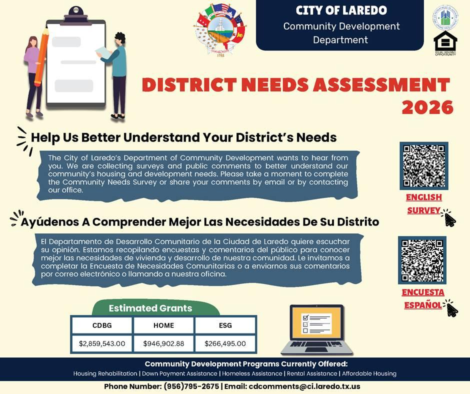 LAREDO, Texas – The City of Laredo Community Development Department is inviting residents to participate in the 2026 District Needs Assessment, an important community survey designed to gather public input on housing, neighborhood improvements, and community development priorities across Laredo.