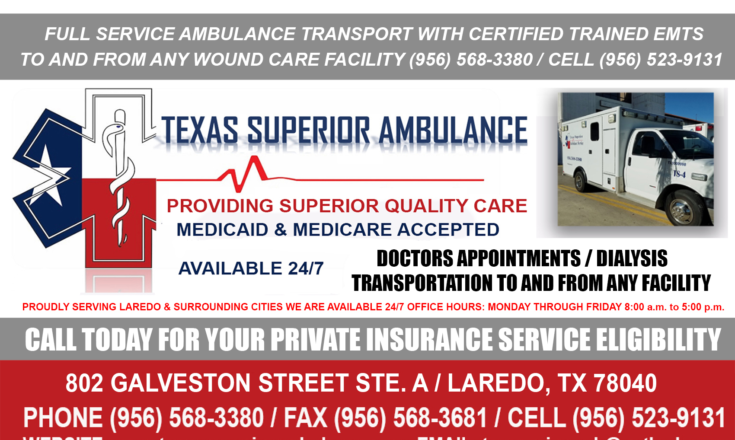 Courtesy Joe Martinez, (Laredo, Texas)-If you or a loved are in need of an ambulance for transportation to and from any wound care facility in Laredo or a surrounding city. Call Texas Superior Ambulance Service at 956-568-3380 and ask for Kimberly. She will guide you through your insurance or Medicaid or Medicare eligibility to set